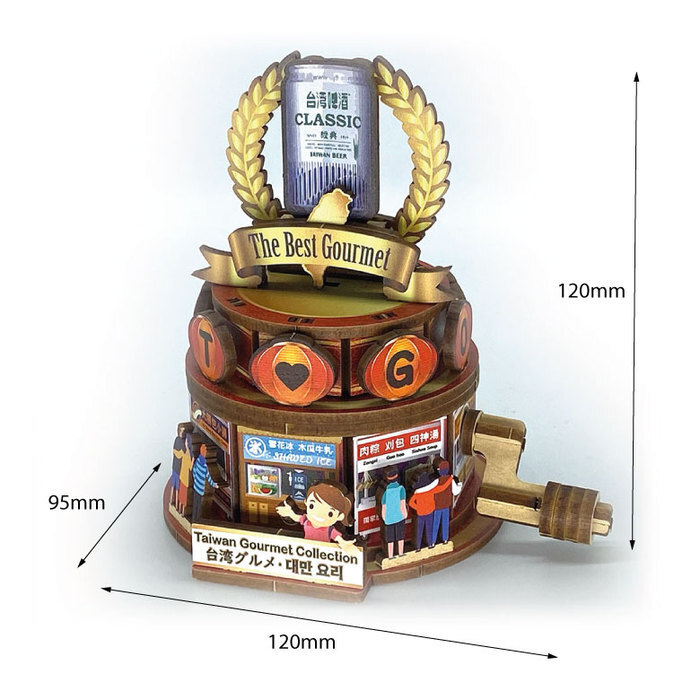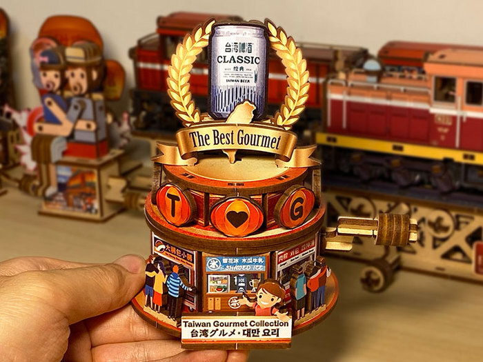 台灣美食總匯,以簡單的機械結構及可愛的造型,呈現台灣夜市及美食特色,內含16種台灣知名美食可自行替換,適合12歲及以上用戶動手組裝。