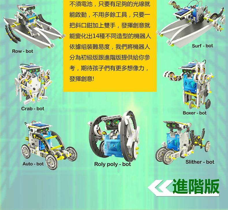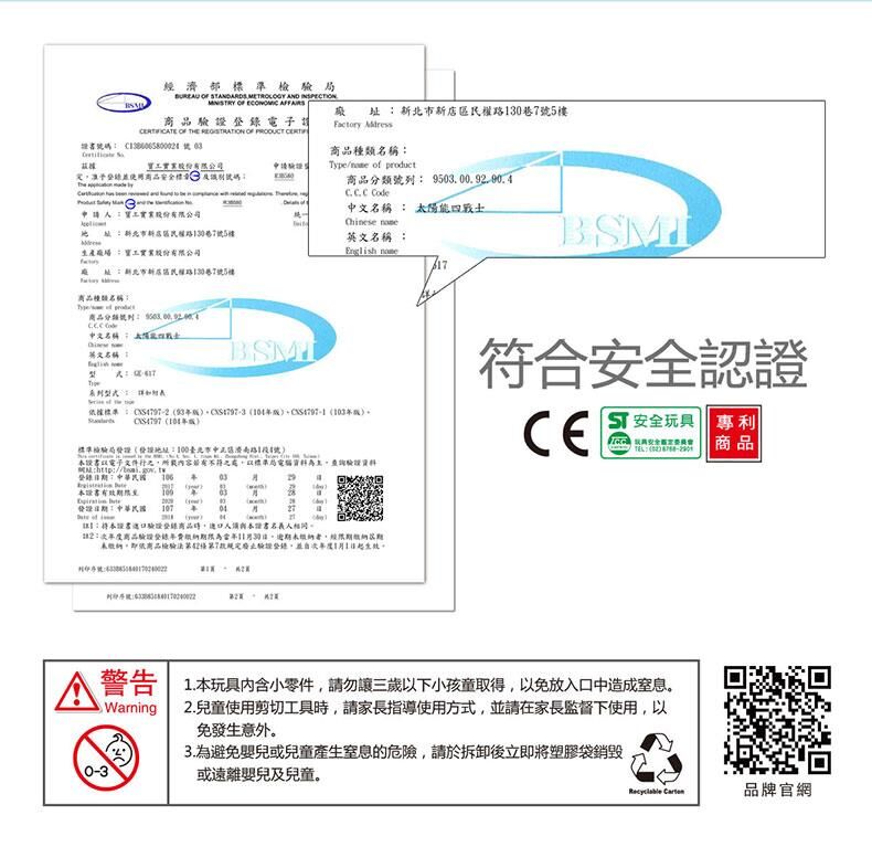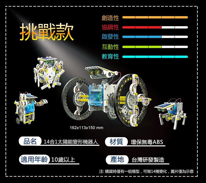 通過ST安全玩具認證,100%台灣製造安全無慮,透過模型機構設計,可組裝14種變化,可學習到太陽能轉電能原理及動力機械力學原理。