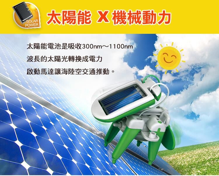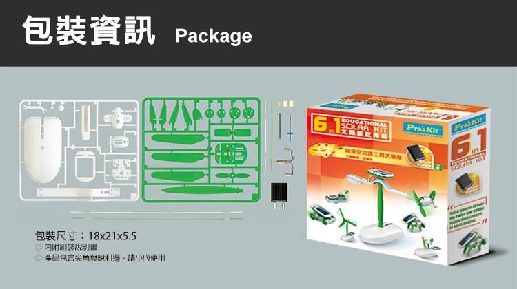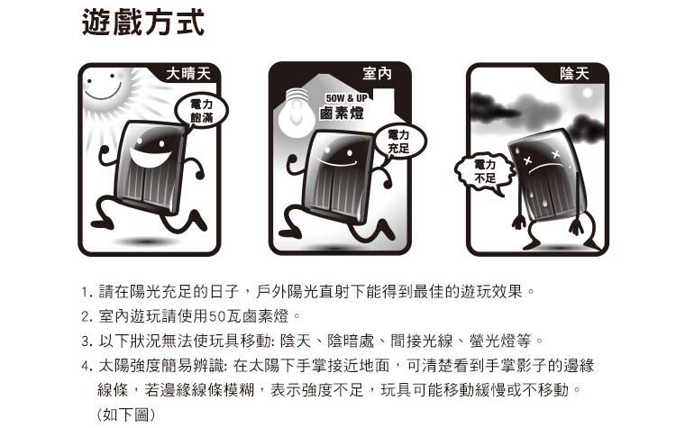 詳細的圖解安裝說明書,經由動手組裝過程,養成耐心、觀察力、閱讀…等習慣,並啟發想像力及創造力,還可學習到太陽能轉電能原理及動力機械力學原理。