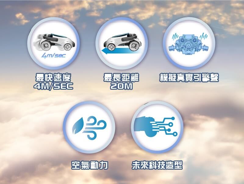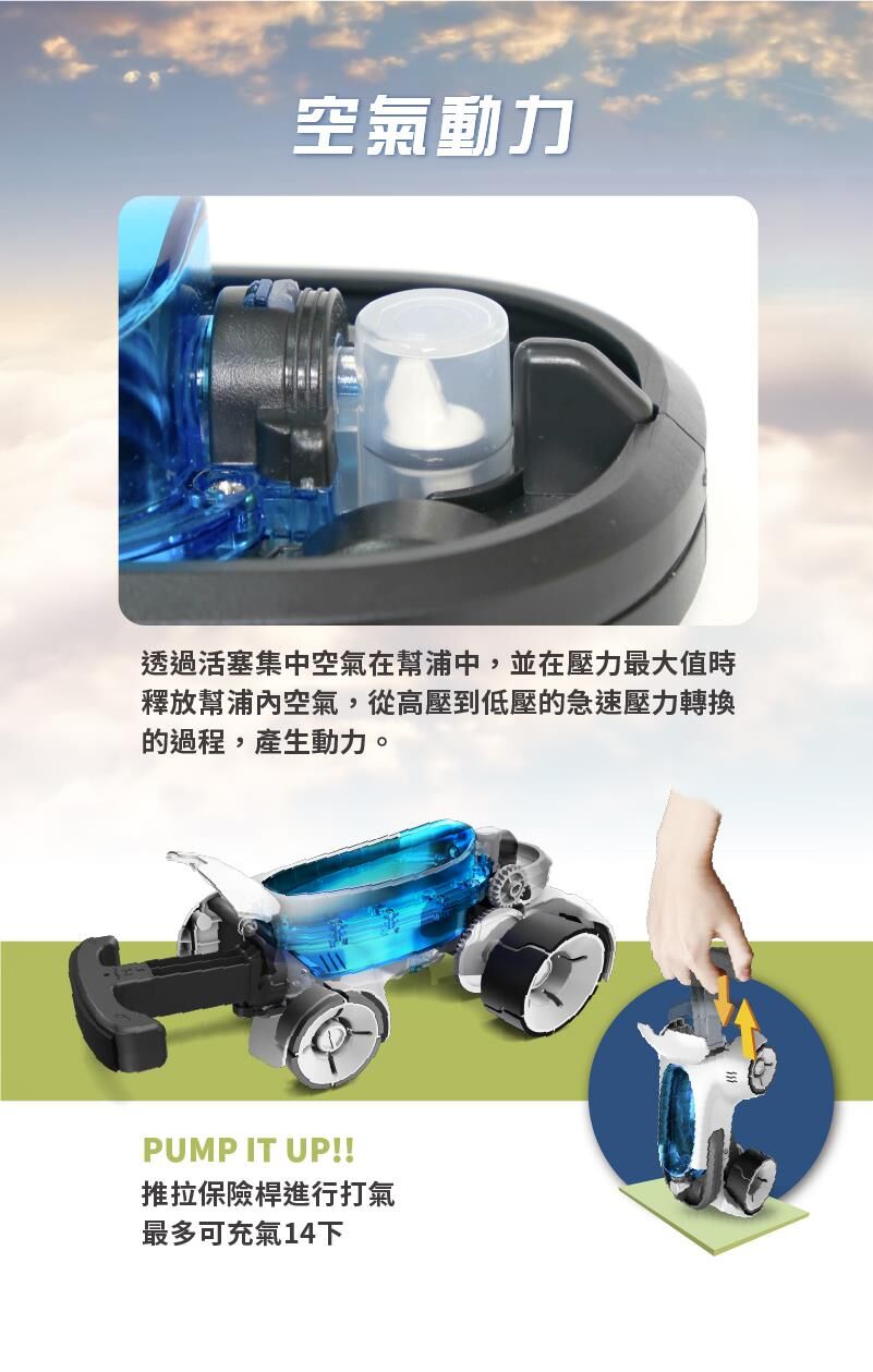 造型科技感的超跑,使用空氣動力奔馳,打氣汽缸與車子融為一體,輕巧方便攜帶到各處玩!最多可打氣14下,最快速度每秒4米,最長距離可跑到20米!還可以將超跑裝飾彩繪成自己喜愛的模樣!