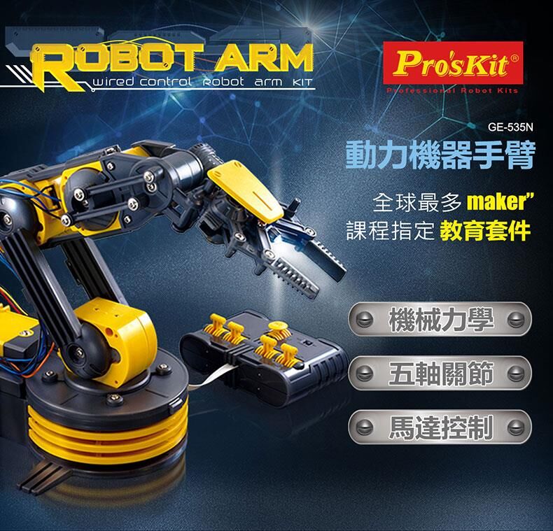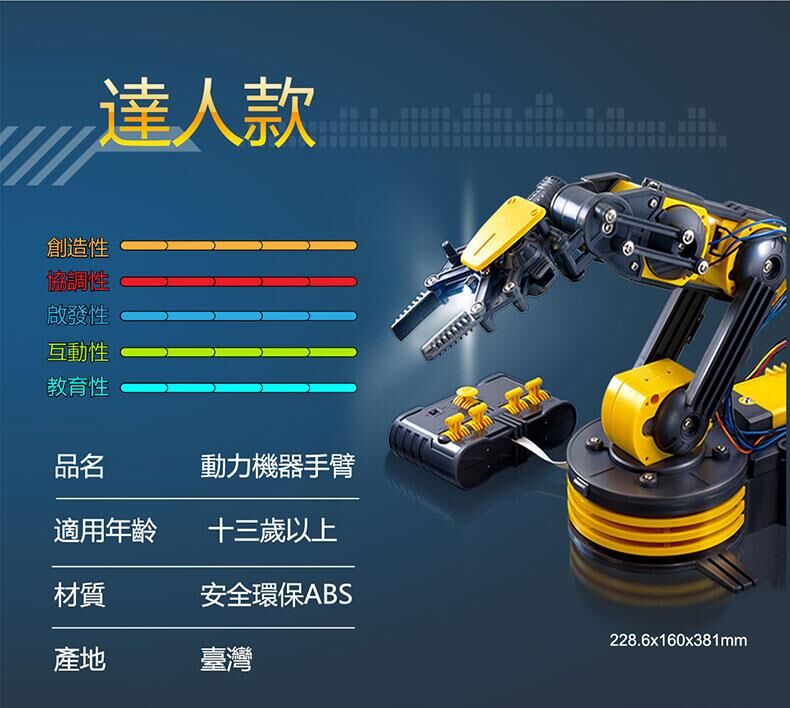 透過組裝與操作過程;可以認識與了解機器手臂的機械動力原理。此機器手臂藉由線控上的五個開關來啟動手臂上五個馬達進行多軸控制,搭配270度旋轉的底座,180度關節旋轉,無論抓取、抬高、下降或是鬆開夾爪,操控起來相當順手,前端夾爪還可以舉起100g的物品,滿足小小工程師的願望!