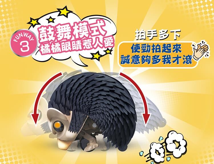 GE-896AI鼓掌刺蝟,內建聲控感應,只要接收到不同的鼓掌次數將會如同真正的刺蝟般,張開刺甲、蜷曲身體、做出各種相應的翻滾動作。