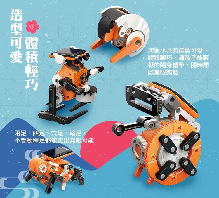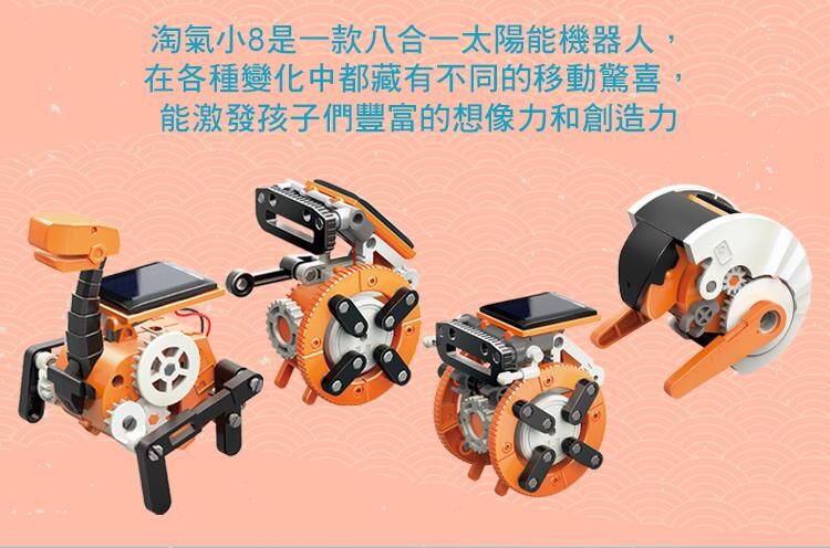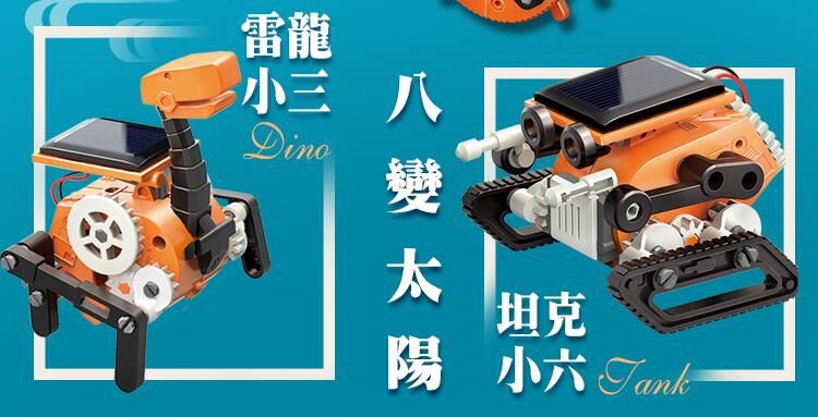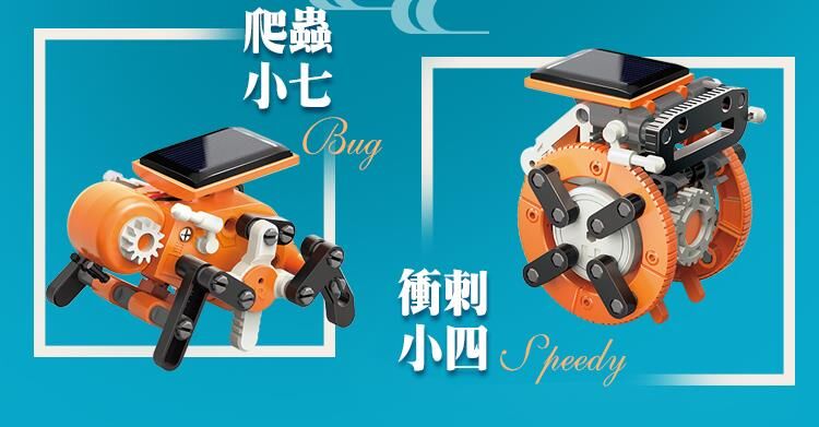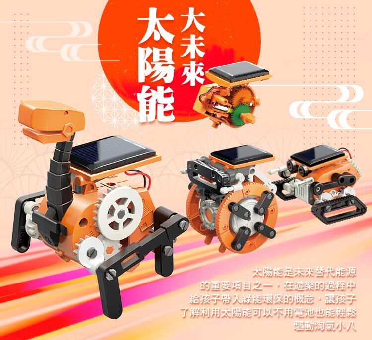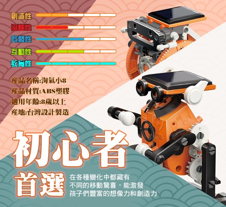 環境安全、無毒、乾淨的太陽能模型玩具,不需要電池即可操作,孩子可在玩樂中同步學習到綠能太陽能+齒輪機械動力科學啟發!體型輕巧可愛,8合1多種玩法 ,創意挑戰樂趣更多!享受陽光,享受戶外,健康100!