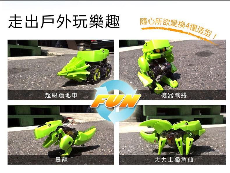 孩子可在玩樂中同步學習到綠能太陽能+齒輪機械動力科學啟發,四種變形組合,機器戰將/暴龍/鑽地車/獨角仙,樂趣多4倍~