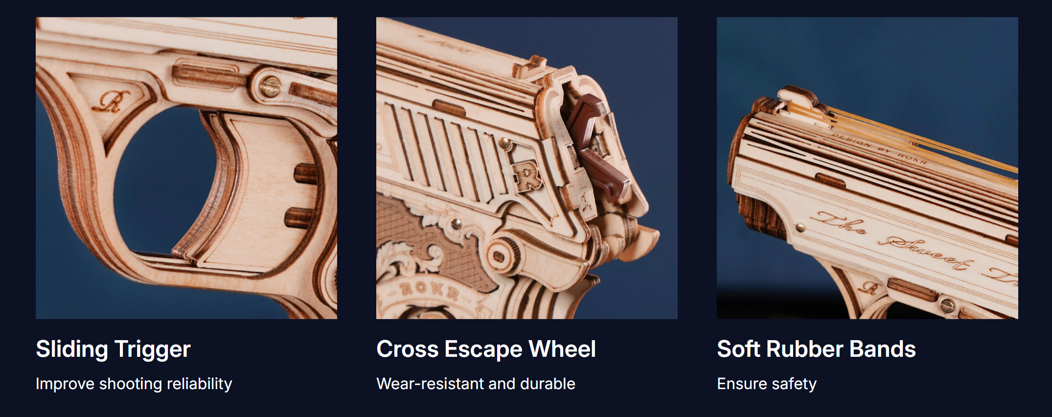 組裝過程兼具挑戰與樂趣,擁有真實的機械運作與細緻外觀,配備可拆卸彈匣與可動扳機,滑順手感與清脆聲響,宛如真槍體驗。