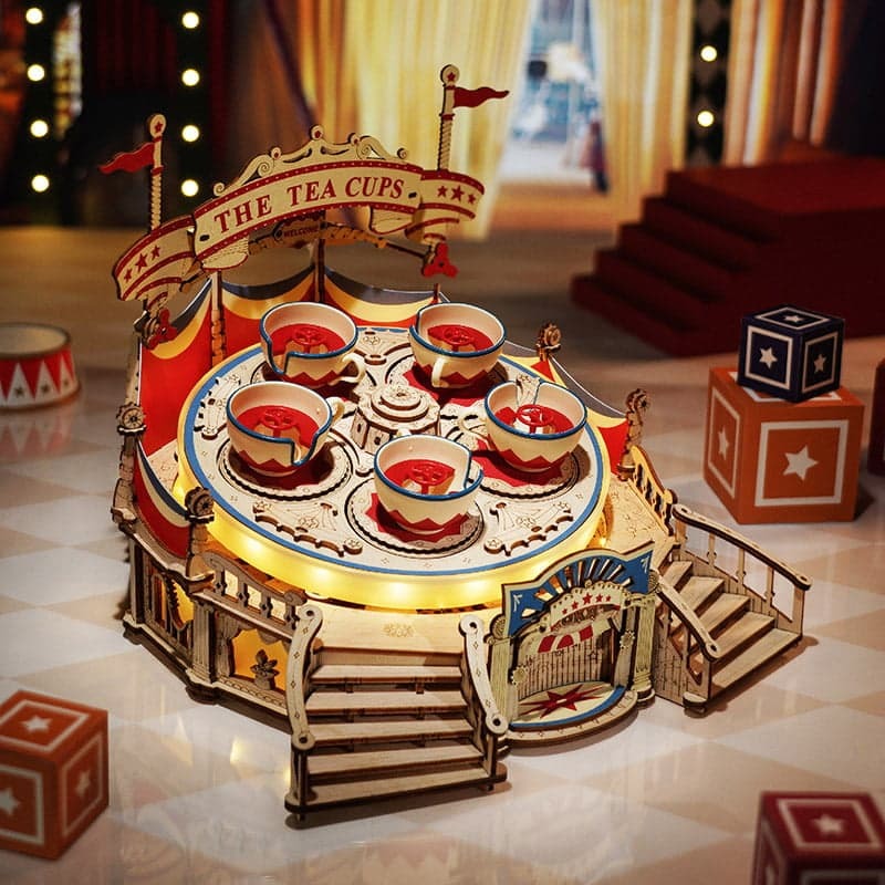 輕觸開關,旋轉杯隨即啟動,燈光閃耀、音樂響起,嘉年華正式展開。