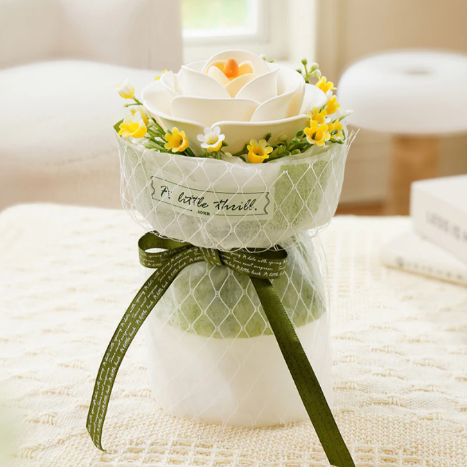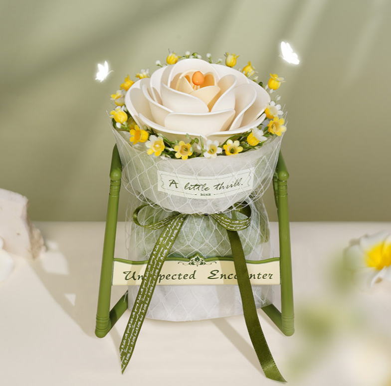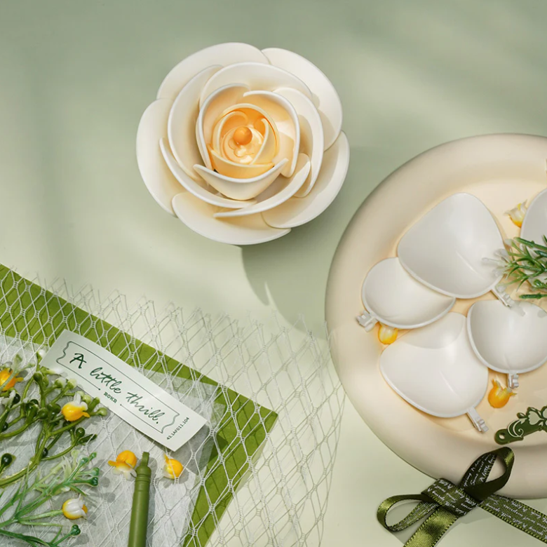 這件花藝作品以法式風格為靈感,柔軟層疊的花瓣、優雅彎曲的花莖,再搭配散落於花蕾周圍的鈴蘭與夜來香,構成一幅細膩動人的景致。