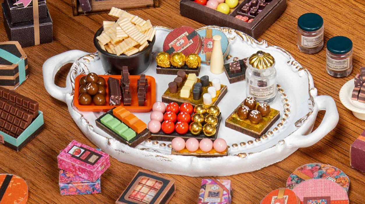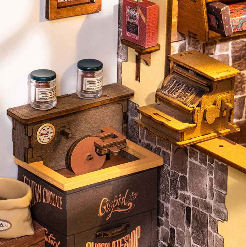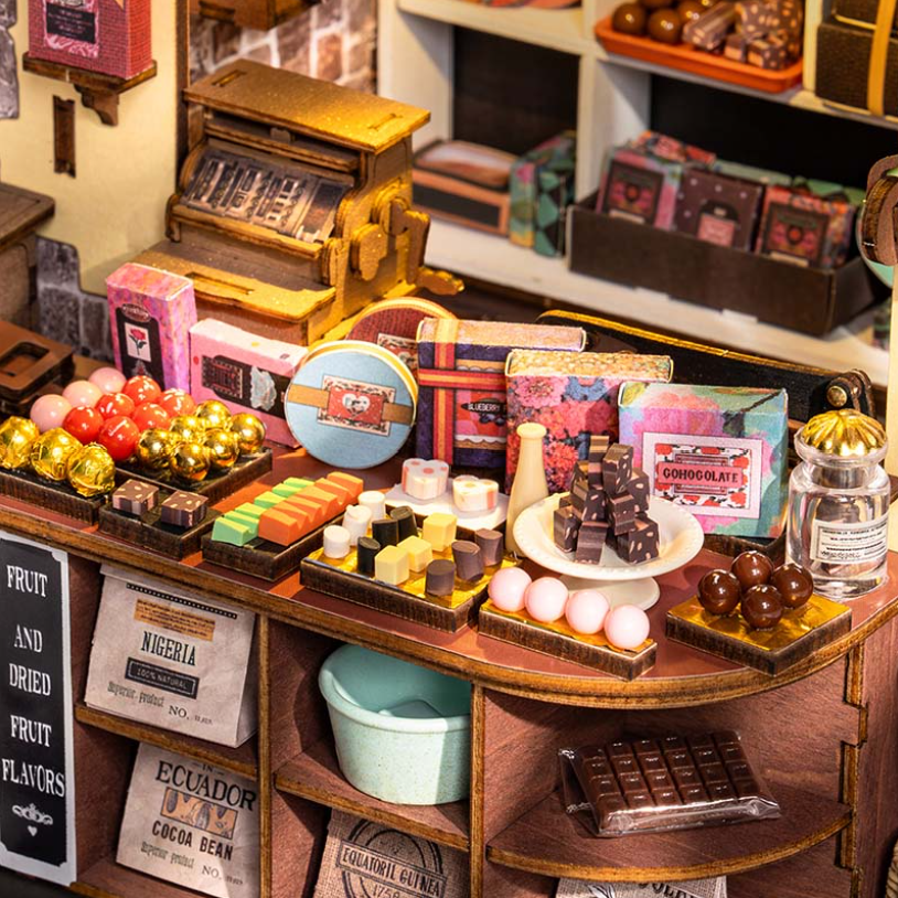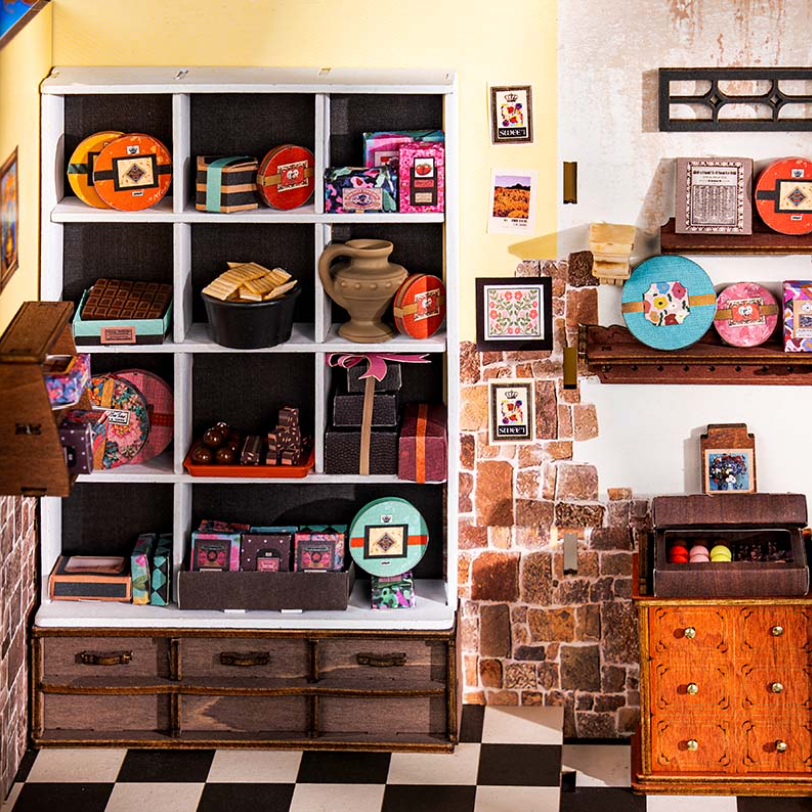 歡迎來到每位巧克力愛好者的夢想天地—一間專賣精緻甜點與手工巧克力的特色小店,層架上擺滿令人垂涎的甜品:盤裝、盒裝、鐵罐、玻璃瓶,各式各樣的巧克力在復古風的老派巧克力工坊裡閃閃發亮。