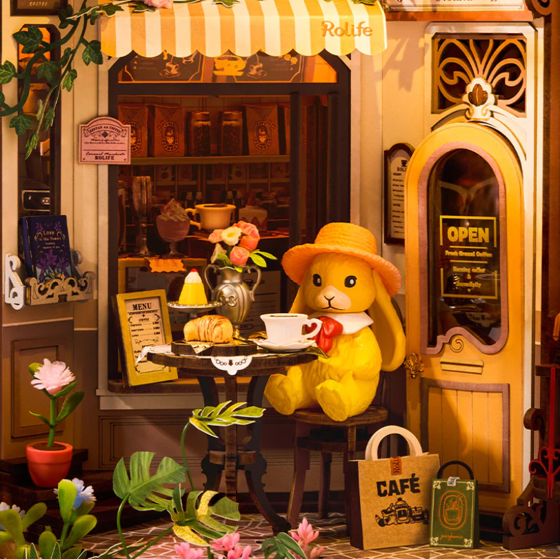 黑板菜單、逼真的義式咖啡機、木質櫥櫃、裝飾植物與迷你甜點,都讓這間庭院式咖啡館更加生動迷人。